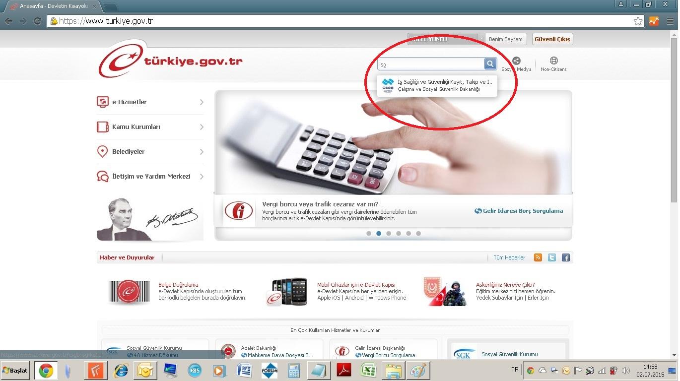Giriş yapıldıktan sonra sağ üst kısımdaki hizmet adı, anahtar kelime, plaka şeklinde açıklama bulunan arama çubuğuna isg yazıp bekleyin, arama motoru yazdığınız kelimenin altına iş sağlığı ve güvenliği kayıt, takip ve ... adında bir hizmet bulacaktır. Bu hizmete tıklayın.
