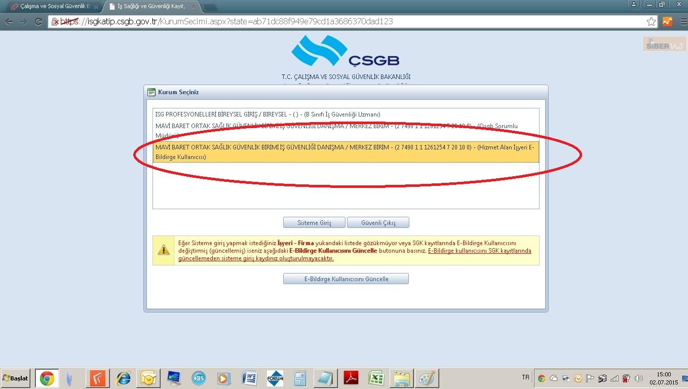 Giriş düğmesine bastığınızda Kurum Seçiniz ekranı geleccek ( eğer gelmezse alt kısımdaki E bildirge kullanıcısını güncelle düğmesine basınız ve 1 gün sonra tekrar deneyinzi ). Atama yapılacak SGK numarasını ekrandan seçiniz, seçim yapılınca numara sarı renge dönüşecektir. Daha sonra sisteme giriş düğmesine basınız.