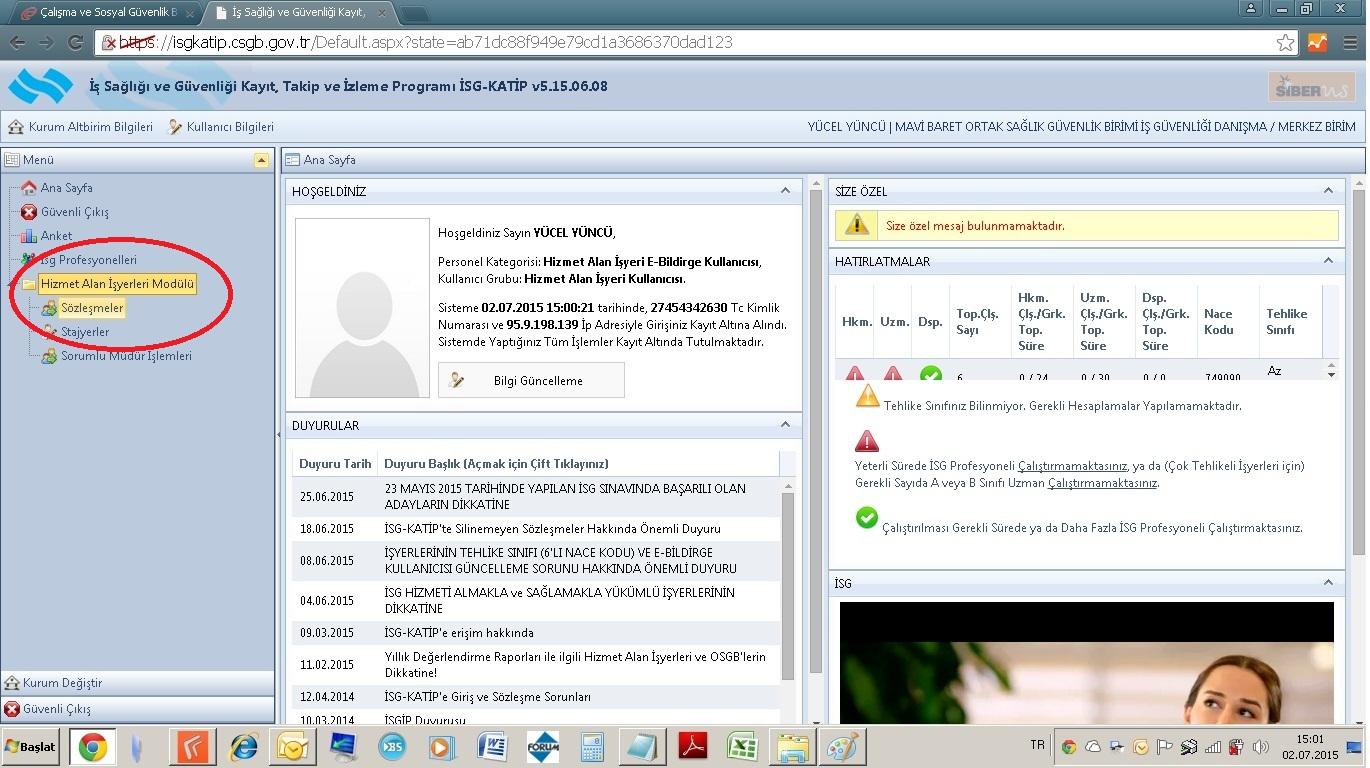 Sisteme giriş düğmesine bastığınızda sicilinize ait ekran gelecek, sağ kısımda yer alan menüden Hizmet Alan İşyeri Mödülüne basınız, altına açılacak Sözleşmeler sekmesini tıklayınız.