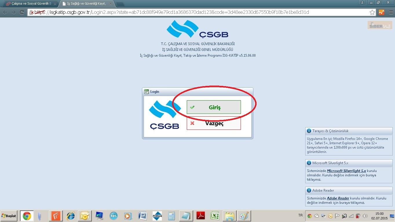 Düğmeye basınca login sekmesi açılacak Çalışma ve Sosyal Güvenlik Bakanlığı Logosunu göreceksiniz. Buradan Giriş düğmesine basınız.