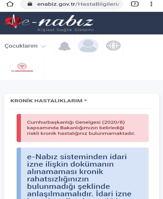 Bunun dışında olan ya da kronik rahatsızlığı olup da bu kategoriye girmeyen çalışanlar için bu idari izne ilişkin dokümanın alınamaması kronik rahatsızlığınızın bulunmadığı şeklinde anlaşılmamalıdır. İdari izne konu kronik rahatsızlıklar, sağlık bakanlığı ilgili Bilim Kurulları tarafından hazırlanan görüşler doğrultusunda Covid-19 açısından yüksek riskli kronik rahatsızlıklarla ilişkilendirilerek belirlenmiştir. Oluşan risk skorunu sistem otomatik hesaplayarak idari izne esas raporu oluşturmaktadır.